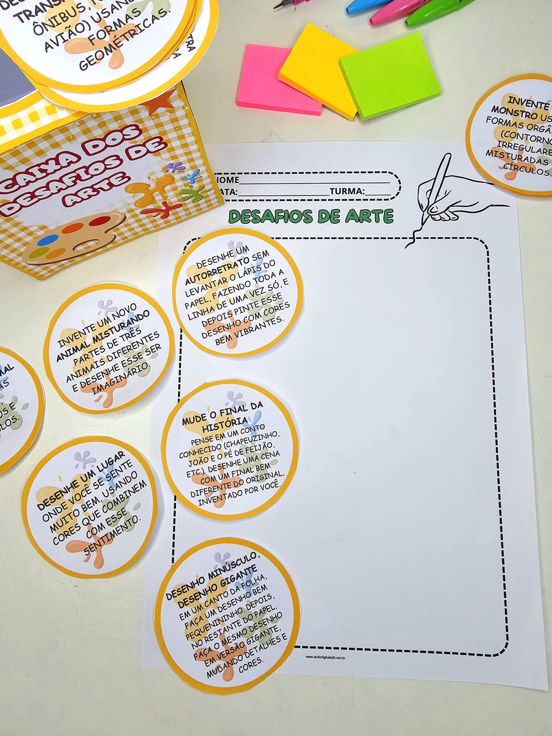 Um recurso lúdico que desperta curiosidade logo no início da aula. Cada desafio propõe uma criação diferente, explorando formas, linhas, cores, imaginação e expressão. Perfeito para momentos criativos, aulas mais leves e dinâmicas.