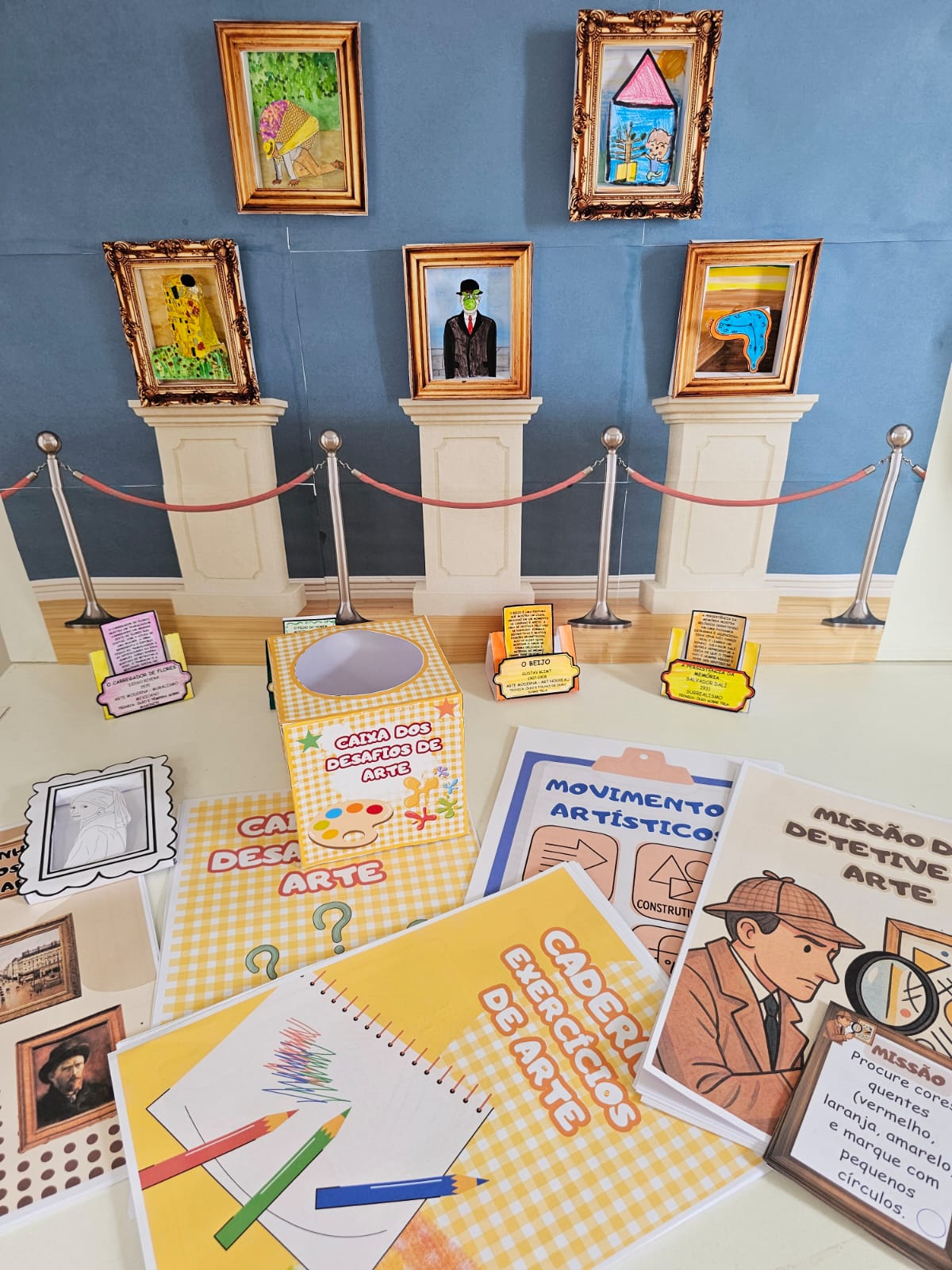 Os alunos constroem mini quadros em relevo a partir de obras famosas. O material inclui molduras, suportes, fichas técnicas e painel com fundo de museu, possibilitando montar exposições, murais e verdadeiros museus dentro da sala de aula.